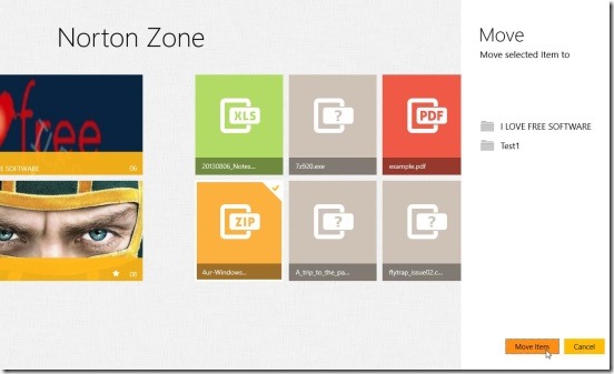 Another good feature of this Windows 8 official Norton Zone app is you can move a file or the whole folder to another location with a single mouse click. Simply select the file/folder and click on Move button. Doing so brings up a list of folders in the right flyout. Simply select the desired folder and click on Move Item button.
