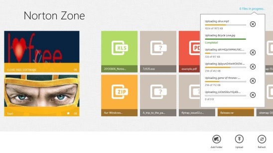 This Windows 8 official Norton Zone app makes it too easy to upload, manage, and share files. You can create, manage, share and delete a folder with one single click, upload multiple files together and cancel uploading for the unwanted, and do lot more! Download this Windows 8 official Norton Zone app from the Productivity Category in Windows Store, and share your photos, videos, files, and documents from your Windows 8 devices.