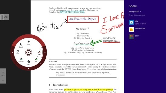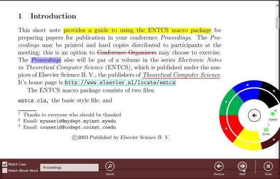 Using this little Windows 8 watermark app was easy. Adding watermarks on a PDF file is extremely easy and fast. The app can easily select words, lines, or paragraphs of the PDF file; and then adds the watermarks. The app has the floating circular tool box, containing all the necessary tools to add watermark. This floating toolbox is pretty powerful and is flexible. You can place it anywhere in the screen and hide-show the tools whenever required. Also, this toolbox lets you select any tool and provides you with different options for that tool using which you can get the desired watermarking tool. And, not to forget, it looks visually good.
