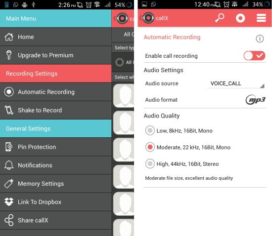 Certain features are paid in this app which will be skipped in this review. Slide from the left edge to the right while in the app to access the menu as seen here. Then tap on the ‘Automatic Recording’ button to access the recording options as seen below. Form here you can enable or disable call recording, select audio source, and audio quality. The app uses mp3 format for recording which delivers good results.