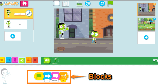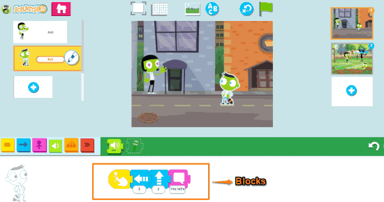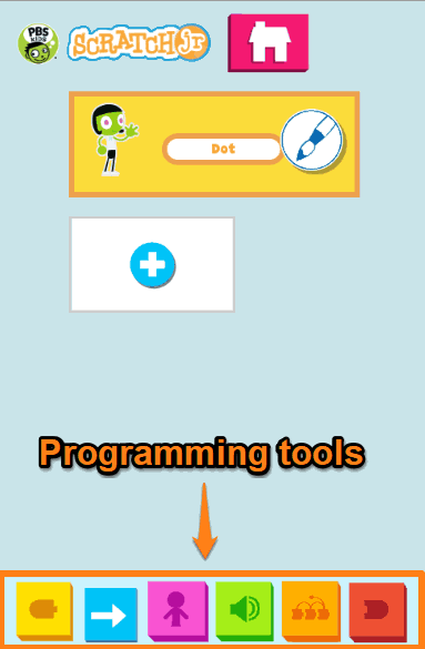There are other options in the interface also. Once your kids start doing programming, they will see a character in the middle of the interface. Kids can edit the character by using tools available on the left. The Yellow box on the left is to edit and paint the character. The plus sign below the Yellow box helps you to add a new character.