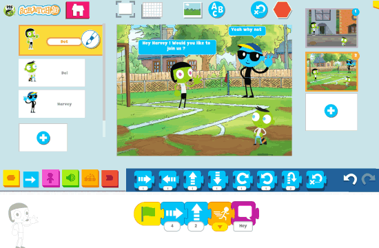 I also made an interactive story with three characters and two locations. The story begins with the meeting of two friends (Dot and Del) in the street. Dot waves at Del and asks him to go to the playground. Del replies to him saying “Yes sure”. Thereafter, when they visit the playground, another friend Harvey meets there and Dot asks him to join. Harvey agrees happily. Del gets excited and tells Dot and Harvey to start the game.