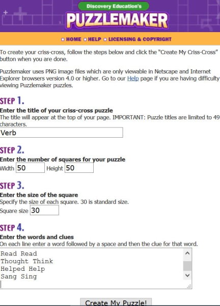AtoZ Teacher Stuff also provides a crossword puzzle maker which is pretty easy to use. The interface of the crossword puzzle maker can be seen in the screenshot above. At the top, enter the title of your puzzle. Then enter the word and clue sets as instructed. Once done, click on the make my crossword puzzle button.