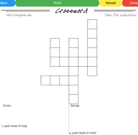 The crossword puzzle generated will look like the screenshot above. The grid is given with clues at the bottom. There are options like print, reload, close, etc. given at the top of the page. The print option can be used to take a print of the puzzle.