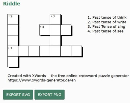 The puzzle will be created and displayed to you on the same page. This can be seen in the screenshot above. The puzzle grid and clues and given side by side. You have two options at the bottom of the page. You can export this puzzle in SVG, or PNG format and save it on your computer. This can later be printed easily. The solution of the puzzle is also available on the same page when you scroll down.