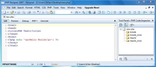 Davor’s PHP Editor was initially designed for personal use, but has now become a powerful PHP editor. Though it provides a lot of good features like other PHP IDEs, but still lacks some important functionalities like support for debugging PHP scripts or making connections to FTP servers. However, the list of features it provides, makes it a worth using software. It has a simple interface, which provides organized, and limited number of toolbar and menus. It provides superfast syntax highlighting capabilities with large undo buffer and automatic backup of saved files. It lets you quickly type code using auto complete and completion proposal features.