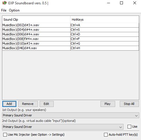 Adding sounds to the soundboard is pretty straightforward. First select the audio clip that you’d like to use, and then assign a keyboard shortcut which will activate the selected audio clip (as long as the application is running). Added audio clips will show up on the main list, see image above. That list is the soundboard basically. Other more interesting features include adjustable volume levels, adjustable output devices (up to two of them) and support for voice chat pass-through. Voice chat pass-through allows you to insert the sounds from the soundboard into voice chats like Skype. List of audio clips, meaning the soundboard, can be saved so that you don’t have to set it up again the next time you run the application.