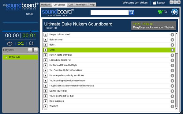 Multiple soundboards can be setup using the left sidebar. They are called playlists here. A neat feature found in My Soundboard is support for loading soundboard clips made by other people from the My Soundboard website. Just use the “Get Sounds” tab up top to look up sounds that you’re interested in, like “laugh track” for example. There are both free and paid audio clips. My Soundboard supports regular playback, shuffling, and repeat.