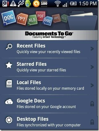 Documents To Go 3.0 Main App is a free office suite app for Android to view or access office documents on Android. This Android office suite app supports MS Word, MS Excel, and MS PowerPoint. You can view document file from any of these three file formats. You can’t edit or apply some special formula on the document. Editing features are only available in full version of the app. You can check all your recently accessed file, local files from SD card and starred files. Documents To Go 3.0 Main is one of the most popular app in Google Play Store to view office documents on Android phone. File formats supported by the app: