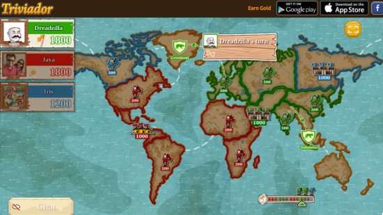 Triviador is a fun trivia game app for Facebook. I liked the concept of this game. You start with clicking the start game option on the home page. Then choose the kind of game you want to play like a normal game, long game, friendly game, etc. As soon as you select the game will assign two opponents for you. So there is three players playing the game and you will have a screen like the one shown in the screenshot above. Each player will be given a 1000 points to start with and can select areas on the map that they like. You can select two areas and after that to acquire more land you have to answer trivia questions. Right answer will earn you points and wrong ones will deduct points from your score.