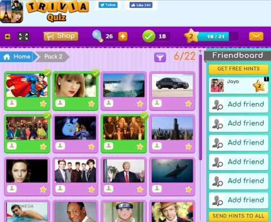 Trivia Quiz is a trivia game app for Facebook where you have to guess the people in the pictures. When you start the game you will see that pack one of the game is the only one which is unlocked right now. So start with pack one and answer a minimum number of questions to unlock the level 2 pack. When you click on play button given with level one, you will be taken to the screen as shown in the above screenshot. You will have about 20 images in this level and you have to answer a minimum of 7 or 8 to unlock level 2. You don’t have to follow any sequence while answering, you can open up any of the listed images and type in your answer.