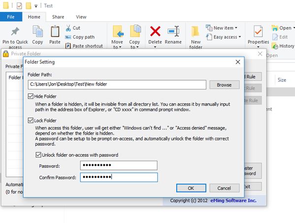 Locked down folders can be hidden, password locked, and permission protected, so that regular users can’t access them. Hidden and locked directories with all the files in them are not easily found. They are not just “hidden” via attributes in their original location, but moved somewhere else for extra protection. To protect and lock files, just select the directory where they are located, choose what kind of protection you want and you’re done. Image above shows Private Folder in action.