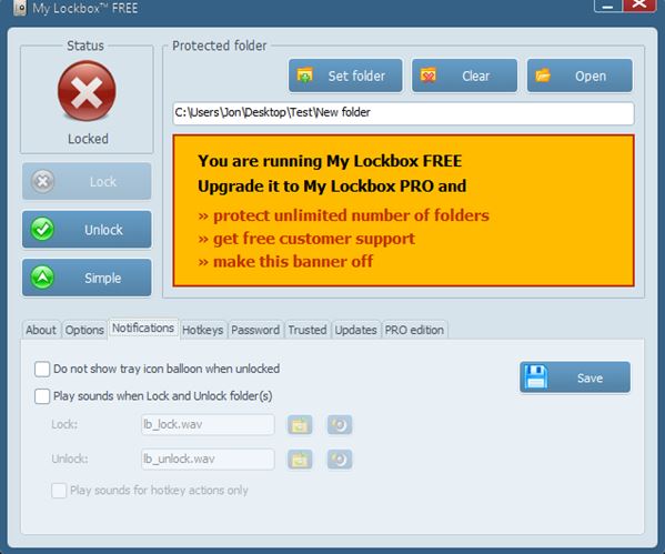 My Lockbox is another file locker software which locks files in entire directories at once. It’s very simple, and only works on one folder at a time. When you lock a new folder, the old one gets unlocked. Keep that in mind so you don’t end up with unprotected folders.