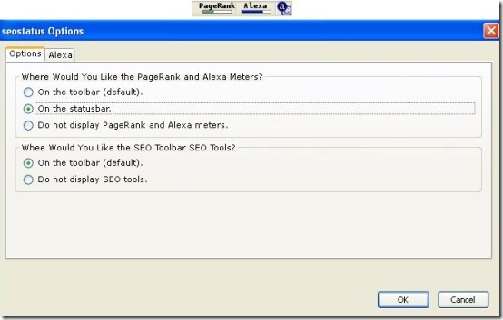 SEO Status PageRank/Alexa Toolbar is a free Firefox plugin to check Alexa page rank of webpages accessed on Firefox browser. This Firefox plugin is a simple plugin that gives Google Page Rank and Alexa Page Rank of the webpage. You can head to options menu to let the plugin display the page ranks on status bar/add-on bar or toolbar of the browser. The plugin displays the page rank in the form of progress bar. if you want to check the exact page rank in number, then put the mouse cursor on the progress bar of Alexa Page Rank or Google Page Rank.