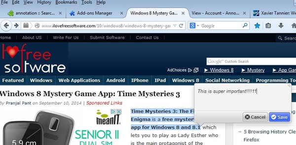 Annotate It is perhaps the best annotation addon for Firefox. It’s simple. All that you have to do is register an account with AnnotateIt.org website and the addon will let you create and save annotations simply by making selections of text that you’d like to annotate.