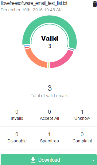 QuickEmailVerification is a bulk email verifier website. It performs RFC syntax checking and deep SMTP testing to check whether an email is attached to a mailbox or not. In its free plan, it allows you to free verify 100 emails per day. Getting started with this bulk email verifier is really easy, you need to create a free account on it to use it. You can create one from here. After logging into it, simply drag and drop your email list that can be a CSV, TXT, XLS, XLSX, or ODS format. After you have uploaded a list it will start verifying email addresses and display results in a pie chart, as shown in the screenshot below.