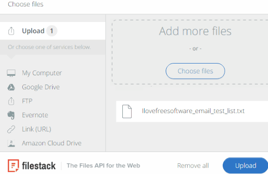 It allows you to import email list in TXT or CSV format from your PC, or Google Drive, Amazon Cloud Drive, etc. After selecting a file, click on the Upload button to import the email list for bulk verification.