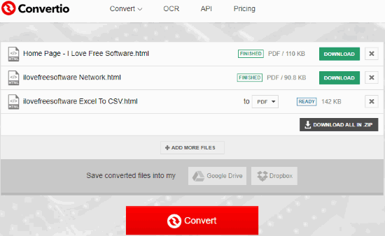 Convertio is the second best HTML to PDF converter website here. This website helps to batch convert HTML to PDF documents. You can upload multiple HTML files from PC, Dropbox, or Google Drive accounts and then it will convert 2 input files at once. Once the conversion is completed, it will convert the next two files available in the queue. For each output PDF, a separate Download option is provided. You can save all files at once also. If you want, you can save PDF files to your Dropbox or Google Drive account also. So, the features are very useful.