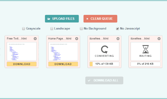 You can also enable some extra options like generate PDF in greyscale, no JavaScript, no background and enable landscape mode. When the conversion process is completed, you can save PDF files one by one using the Download button or save all PDF files at once in a zip file using DOWNLOAD ALL button.