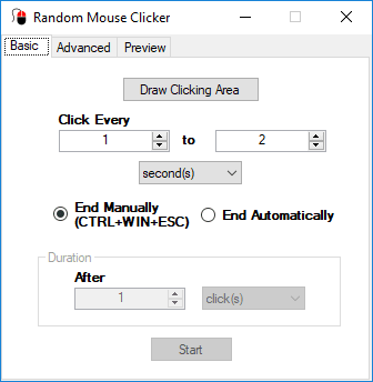 Using Random Mouse Clicker software to automatically click in an area is very simple. On the main interface of the software, you can use the Draw Clicking Area button to select a specific area on your screen. After that, you can specify the other parameters like clicking interval and when to stop the clicking simulation. And once you are done specifying all these parameters, you can preview how the simulation will look like. For that, you can use the Preview tab of the software. And after ensuring that the simulation is correct, you can start it.