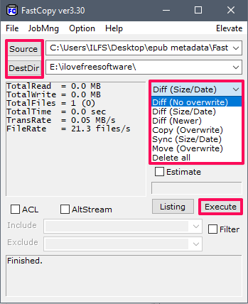 Getting started with this free software is very easy. FastCopy comes as a portable software so you can start using it right after you have downloaded it from the above link. Now, launch the executable of FastCopy and then its interface will pop-up. You will see two fields there, namely: Source and DestDir. Provide the full path of the file that you want to copy in the Source field and provide the path where you want to copy the file in the DestDir field. After that hit the Execute button, and your file will be copied to the destination path and you will see that the file attributes are still the same.