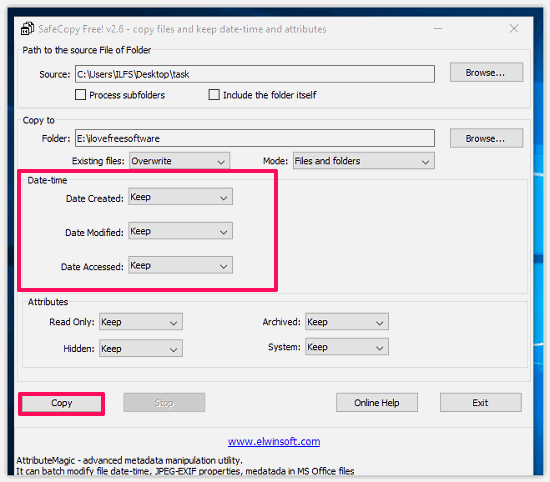 Download the portable EXE of SafeCopy from above link and then launch it from the directory where you have downloaded it. After that, specify the path of the file that you want to copy. Now, specify the destination path. Now, specify the attributes that you want to keep using the various drop downs given in the software. When all set, hit the Copy button and all files of that folder will be copied to destination folder. The attributes that you chose to keep would be preserved, while others could be modified.