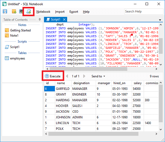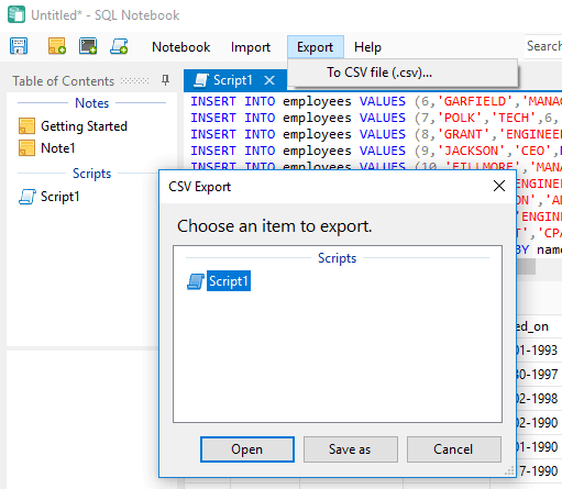 SQL Notebook is an open source software that you can use to convert SQL script to CSV file easily. You can get this software from above link and then install it. And after running this software, you can click on “Add a New Script” button from the toolbar or hit Ctrl+Shift+S. Next, you can paste the SQL code on script editor and then execute that. It will show you the output of the script and to export it, first you will have to save the table.