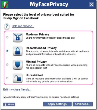 PrivacyDefender is the next tool in this list to manage privacy settings on social networking websites. This tool is specifically meant to manage privacy settings on Facebook. We all know that the privacy settings section of Facebook is the most confusing and time-consuming. But, PrivacyDefender makes life easy for you. All you have to do is visit the page of this tool on Facebook and drag the gray button to your browser bookmark bar. You can then hit the PrivacyDefender link and easily choose the desired privacy level. Rest is done automatically.
