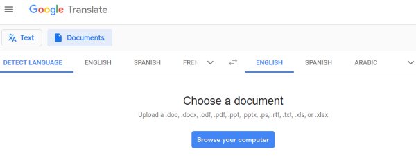 Google Translate can also convert your doc files for you. When you land on the Google translate page, you will see two tabs above the translate box, one for text translation and second for document translation. This can be seen in the above screenshot as well. Select the document tab and you will be shown what all types of documents it supports right inside the translate box. The document formats it supports are .doc, .docx, .odf, .pdf, .ppt, .pptx, .ps, .rtf, .txt, .xls, and .xlsx. Notice that doc and docx are supported. Click on browse your computer button. From the browse window select a doc file which you would like to translate.