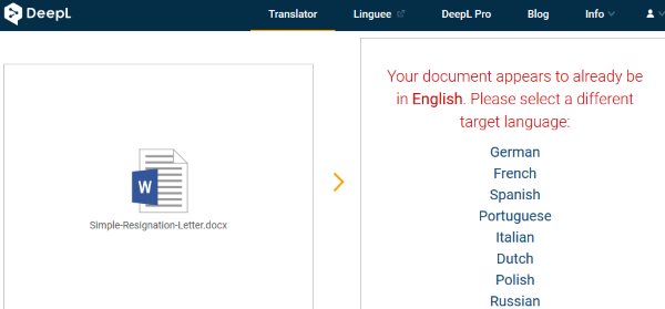 DeepL is a nice website to translate doc or docx files to any language of your choice. When you go to this website you will see an interface like the one seen in the screenshot above. On the left side box, you can upload your doc or docx file. When you click in the box a browse window will open up and let you select a doc file to upload. In the right side box choose the language of translation.