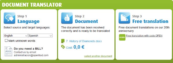 Opentrad is a nice website to translate doc or docx file in to various languages. When you open this website you will see an interface like the one shown in the screenshot above. In step 1 you choose the input language and output language for your doc or docx file. In the second step you can upload the doc or docx file. If your file is less then 5 MB then it will be a free translation for you other wise it is a charged translation. The third step let’s you initiate the translation process.