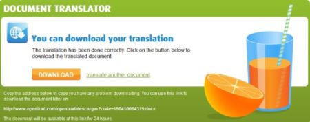 When you initiate the translation, you will get a download link to download your translated file to your computer. You will see a screen like the one seen in the screenshot above. Click the download button to save your translated doc or docx file to your computer.