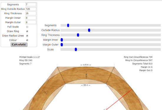 Blocklayer.com is one of the best segmented turning calculator websites. You can enter number of segments, ring thickness, outer and inner margin, outside radius of ring, etc., as input details. You can either use sliders or manually enter input details. The unique feature of this website is it generates a diagram based on input details instantly. The graph is visible within the same page. It gives a much better idea about the output details.