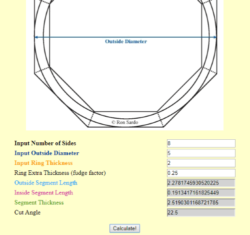 When the details are added, press that Calculate! button. The output will give you details about cut angle, segment thickness, outside and inside segment length. That’s all this website does.