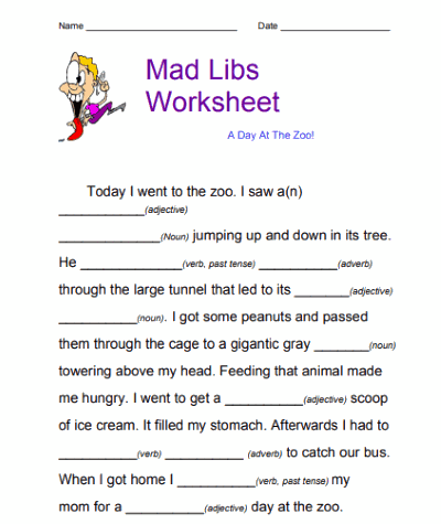 Mad Libs Worksheet (PDF) is basically a PDF file of 11 pages. Each page has a different worksheet which you can print to play Mad Libs with your friends. The PDF file has a good collection of Mad Libs of different categories such as A day at the zoo, the fun park, the great new toy, etc.