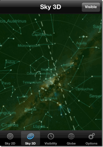 The first astronomy app for iPhone is Planets. This app has 4 main sections: Sky 2D, Sky 3D, Visibility, and Globe. The Sky 2D gives a flat view of the universe while Sky 3D provides you with the planetarium view of the universe. In Sky 3D, you can rotate the view to any angle using your fingers and use pinch & zoom to have a better look at any object. The 3D view also has an option called Visible. This option lets you select the type of view you want to have: Gamma Ray, X-Ray, Visible, Hydrogen ɑ, Infrared, Microwave, and Radio.