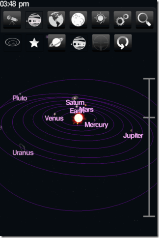 The fourth astronomy app in the list is SkyORB. It provides you with different view angles for exploring the universe. You can pick from Telescopic view, planetarium view, orbital view, etc. The unique feature of the app is that it also lets you choose the time of the day at which you want to explore the universe. For example, if the time at your location is 5 PM but you want to know how does the universe looks when its 9 PM or 9 AM, then you can do so directly with this without even waiting for that particular time.