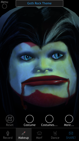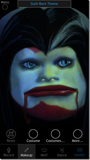 There are many tabs on the bottom panel which have different functions regarding the face you have captured. When you press the ‘Makeup’ tab, you have many options. In ‘costume’ option you may change the hair colour, face colour, eye liner colour according to your preferences. There are many other options to choose from as well but they are all paid.