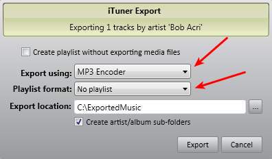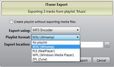 This is undoubtedly the most amazing feature that you get with iTuner. By right clicking on the tray icon of iTuner and then selecting Export a selection will pop-up where you can choose to either export Album, Artist or Playlist, and the window that you’ll get after selecting either one of these options will be the same like when you were exporting playlists. This time we’re not gonna be exporting playlists, but we’re gonna export and encode our music library. This can be done simply by selecting “No playlist” option where we’re asked to choose a playlist format: