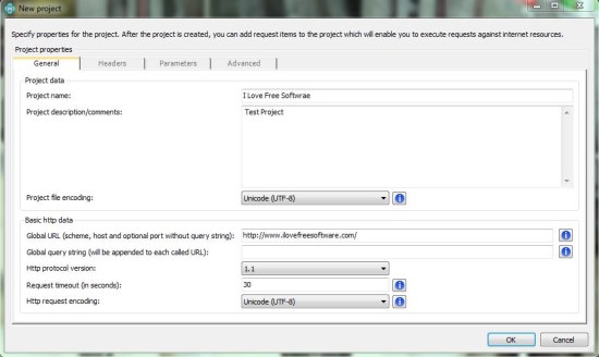 Here you can create new projects, enter specific project data including project name, description, file encoding method, etc., request standard or custom headers, and set dynamic parameters to further fine tune the web requests. These projects will be saved to your local disks with “hmpr” extension.