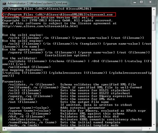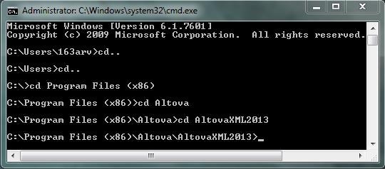 • Navigate to the directory of AltovaXML application file.AltovaXML communitu edition command prompt