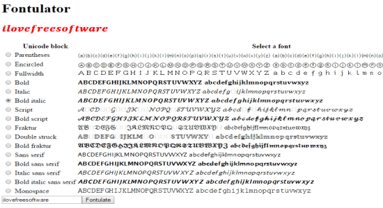Fontulator is another simple and free online service that supports 15+ Unicode formats which you can add to Facebook posts. You can generate text with formats like the script, bold, italic, struck, fullwidth, parentheses, fraktur, and more.