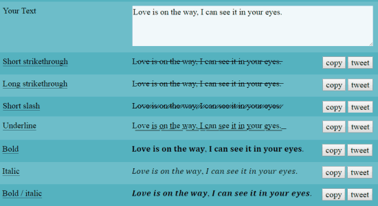 Step 3: Each format is associated with a Copy and Tweet button. If you want to add the Unicode text to Facebook, then use the “Copy” button to copy the text and paste it in the Facebook status box. In addition to that, you can also directly publish the text as tweets using the “Tweet” button.