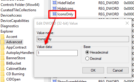 Step 3: On the right-side of the Advanced key, some DWORD values will visible. You have to double-click IconsOnly DWORD value. This will open a small box. Use that box and enter “1” in Value data visible in that box.
