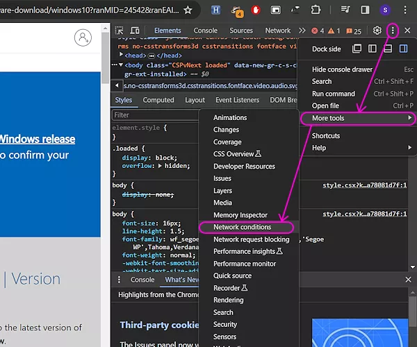 Click the 3-dot button within the Developer tools section to open the menu. Bring your mouse cursor over the “More tools” and then select “Network conditions” from the side panel. This opens a Network condition tab within the Developer tools section. It sits at the lower end of the section from there you can resize it upward to make it larger.