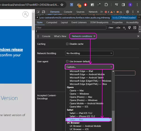 In the Network conditions tab, look for the “User agent” and uncheck it from “Use browser default”. This allows you to pick a different user agent. Click on the drop-down button below and scroll down to Safari options and pick “Safari – Mac“. That’s all you have to do. Do not close the Developer Tools section. Keep it open and reload the web page.
