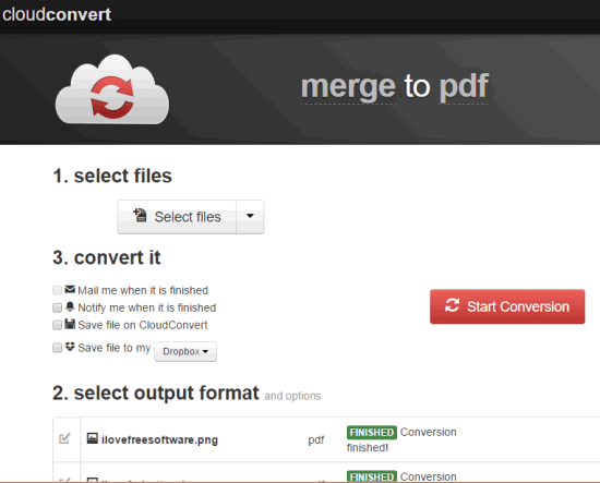 CloudConvert (beta) is one of my favorite websites for creating a single PDF file from multiple images. My favorite feature of this website is that you can upload images from PC, your Google Drive, Dropbox, OneDrive, and Box accounts. Moreover, your output PDF file can also be saved to a particular cloud storage service. This is very handy for those who have images or files on their cloud storage account and want to get the output in that account. But, to use this feature, you must create a free account on CloudConvert.