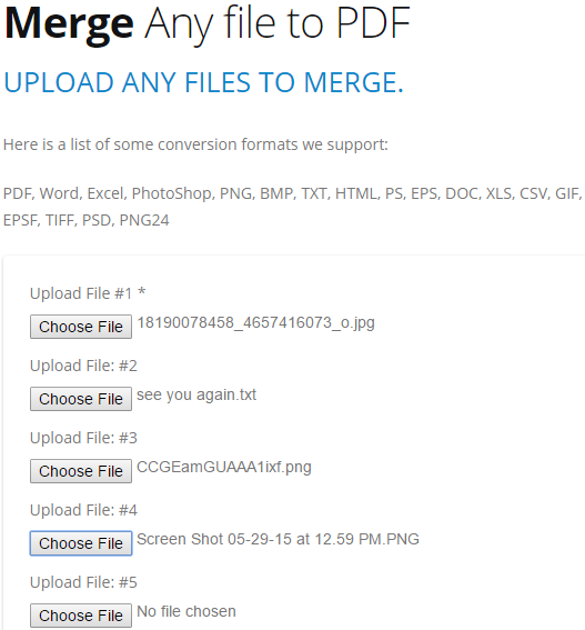 Online PDF Tools is a multipurpose website that offers 4 different tools for free. Among those free tools, PDF Merge tool is used to batch convert images to PDF or any supported file to a single PDF file. You can convert TXT, BMP, XLS, CSV, TIFF, PSD, EPS, DOC, and other supported files to PDF. However, only 6 files can converted at a time. This website also lets you combine files of different types together to get one PDF file as output.