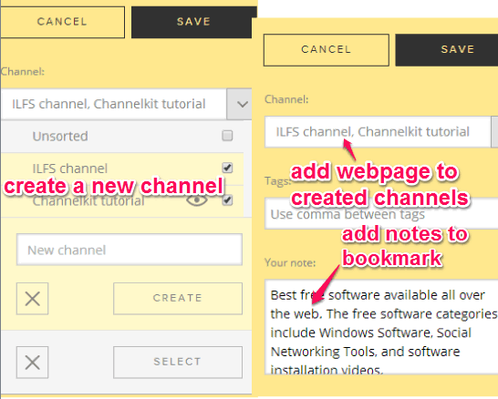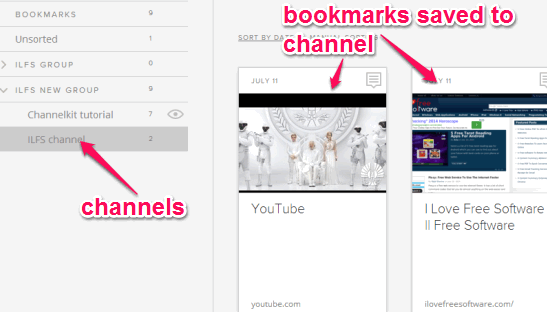 Channelkit (beta) is a free website that helps to bookmark webpages and organize them into your personal channels. That means, you can create your own channels and add any webpage in any channel according to your facility. While saving a webpage, it automatically helps to add title, picture, and note for that bookmark. You can also edit note and change picture to save that webpage.