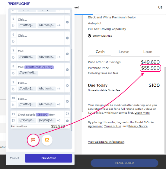 Now your every click on the website is recorded by the extension and added as a new step in the test. You can see that in the extension popup. The popup is draggable, you can place it anywhere on the screen if it comes in your way. In case of a mistake, you can remove a step from the test and proceed with the next step. With the flag button on the extension, you can also add value tracking to the test. Simply drag that button to the value that you want to track in the test. After going through all the steps, click the finish button to end the test and give it a name to save in your Preflight account.
